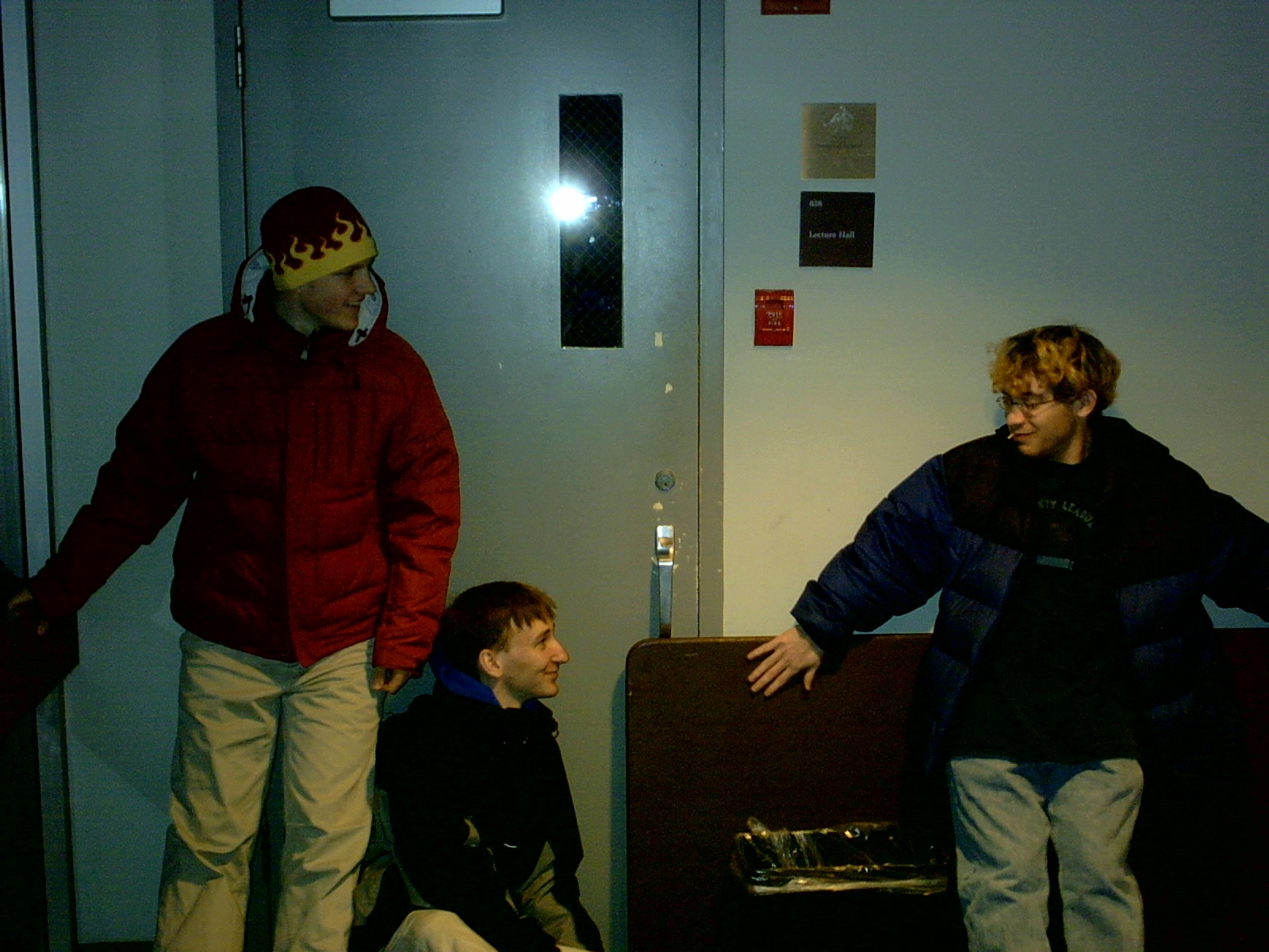 In the center, on the floor, using my body weight to hold the door closed against someone a group of us have trapped in a darkened lecture hall at 4am in the morning. Good times. Notice how we all take pleasure in his distress.